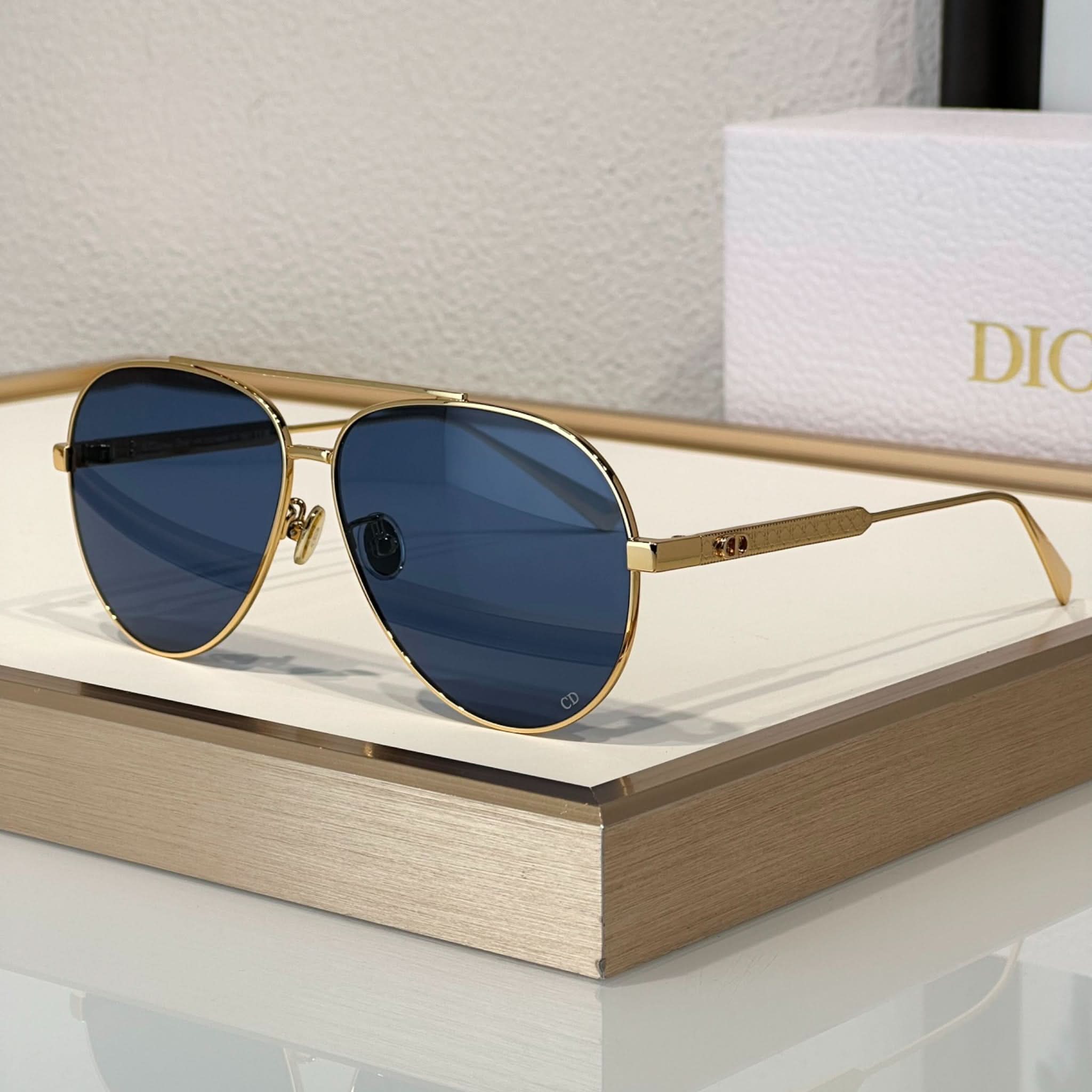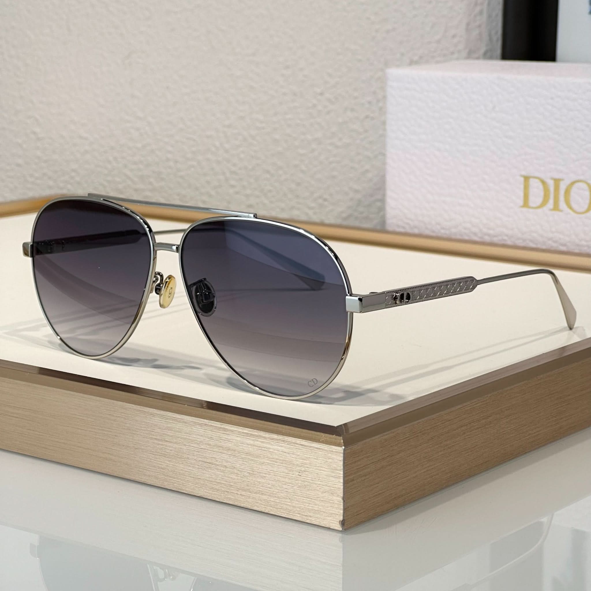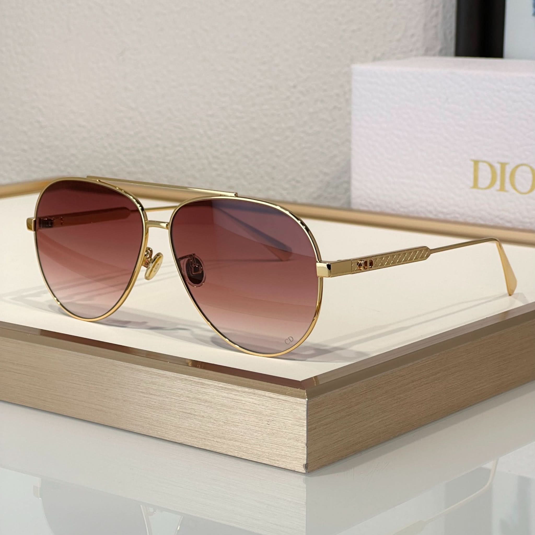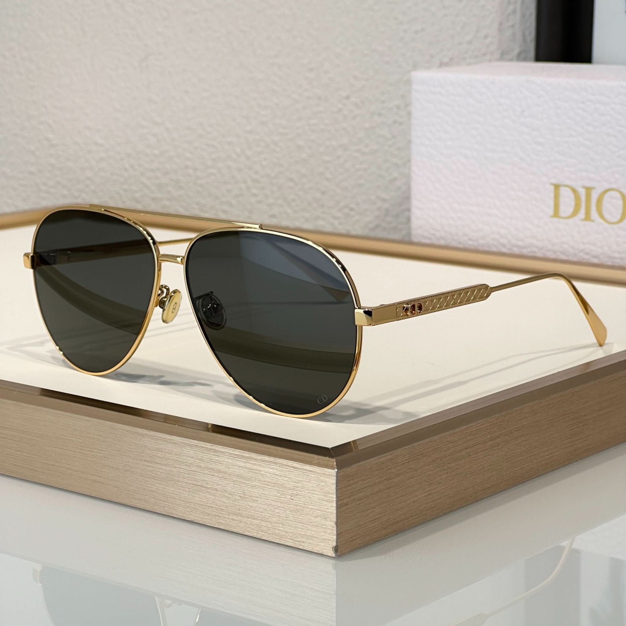 Die Sonnenbrille Eclat Doré vereint Eleganz und Modernität. Dieses Modell besticht durch seinen Pilotenrahmen aus Metall mit dem ikonischen Cannage-Motiv und wird durch filigrane CD-Gravuren an den Bügeln abgerundet. Diese Brille bietet 100 % UVA-/UVB-Schutz und ist dank ihres korrektionsfreundlichen Designs eine funktionale und stilvolle Wahl. Der Dior Schriftzug am rechten Bügel macht diese Sonnenbrille einzigartig.