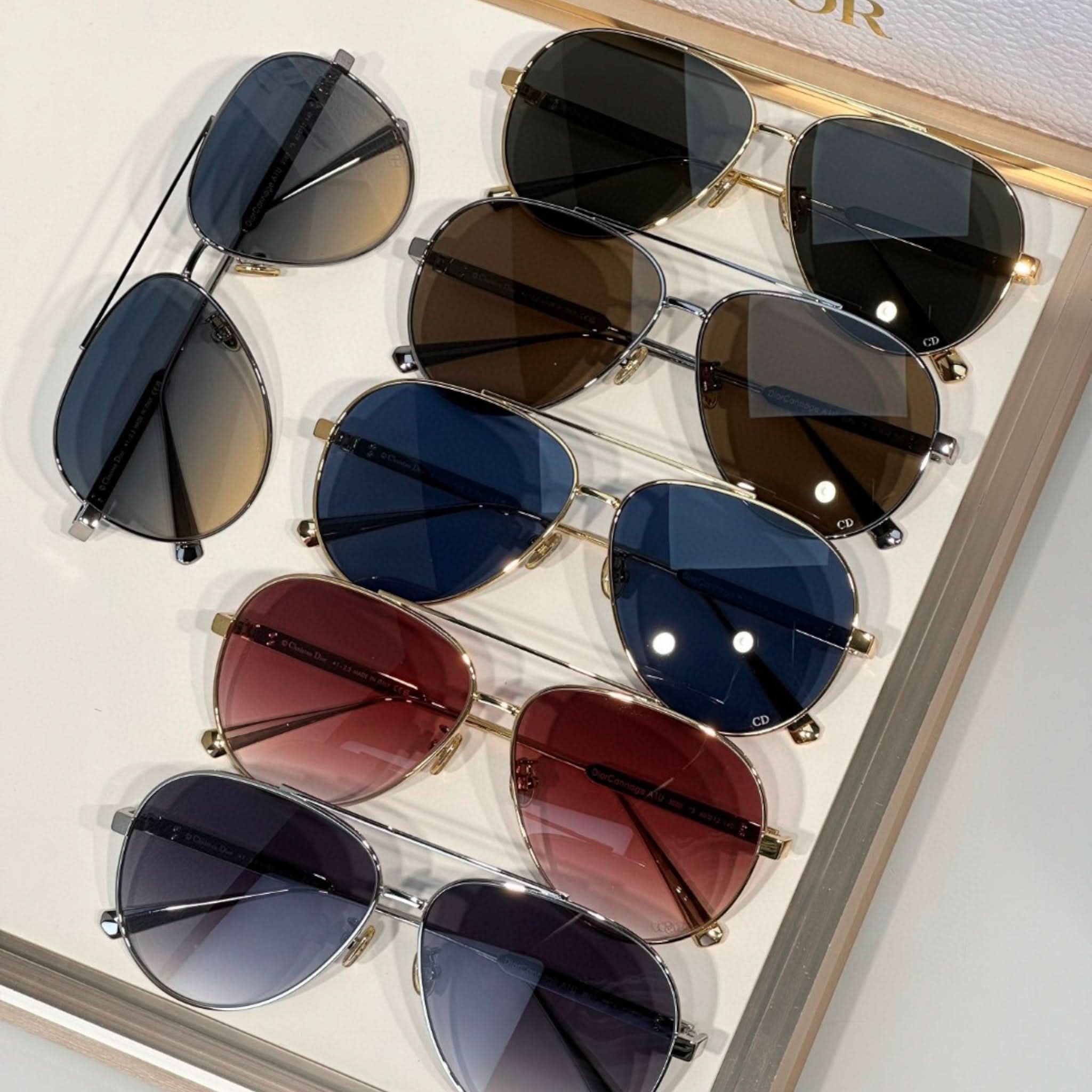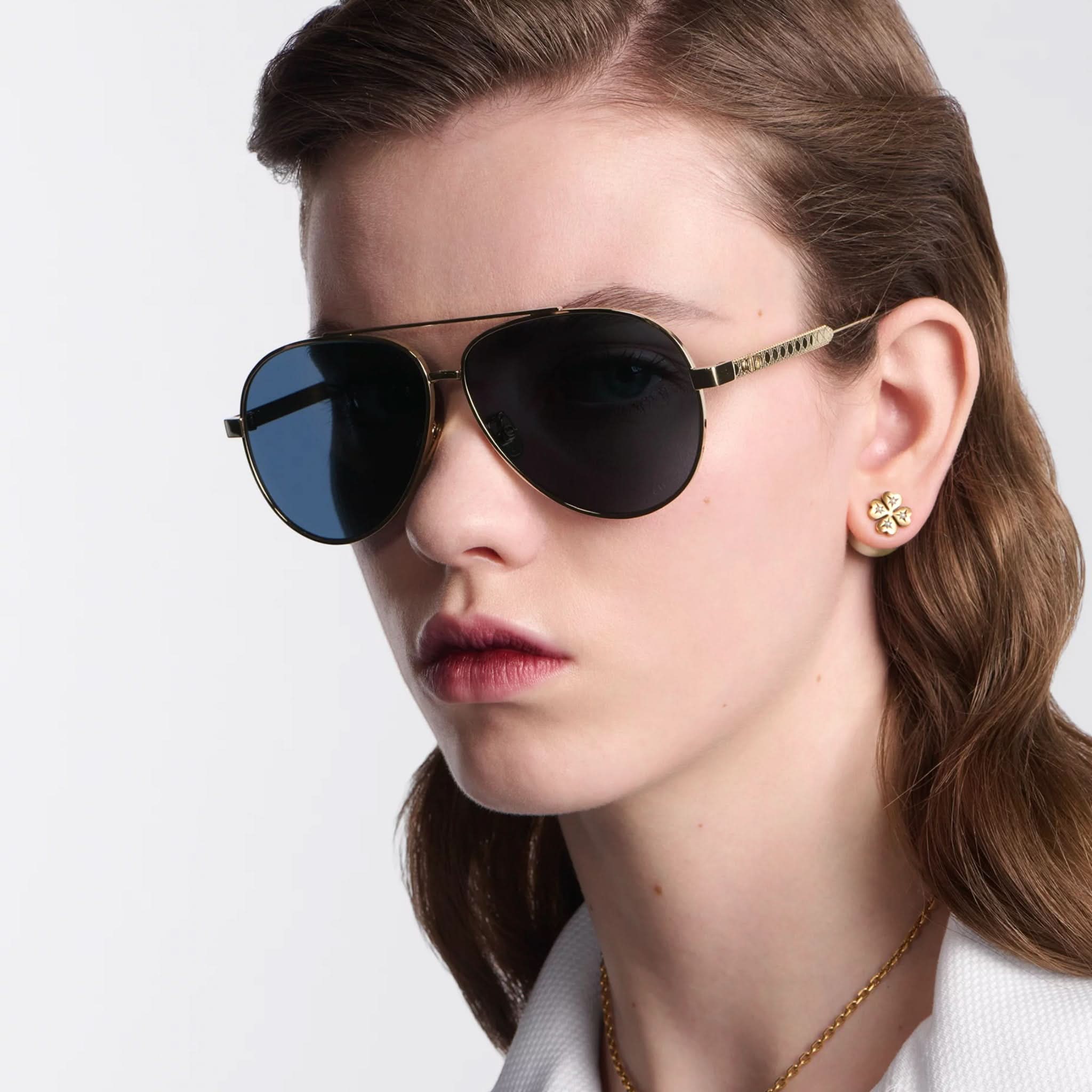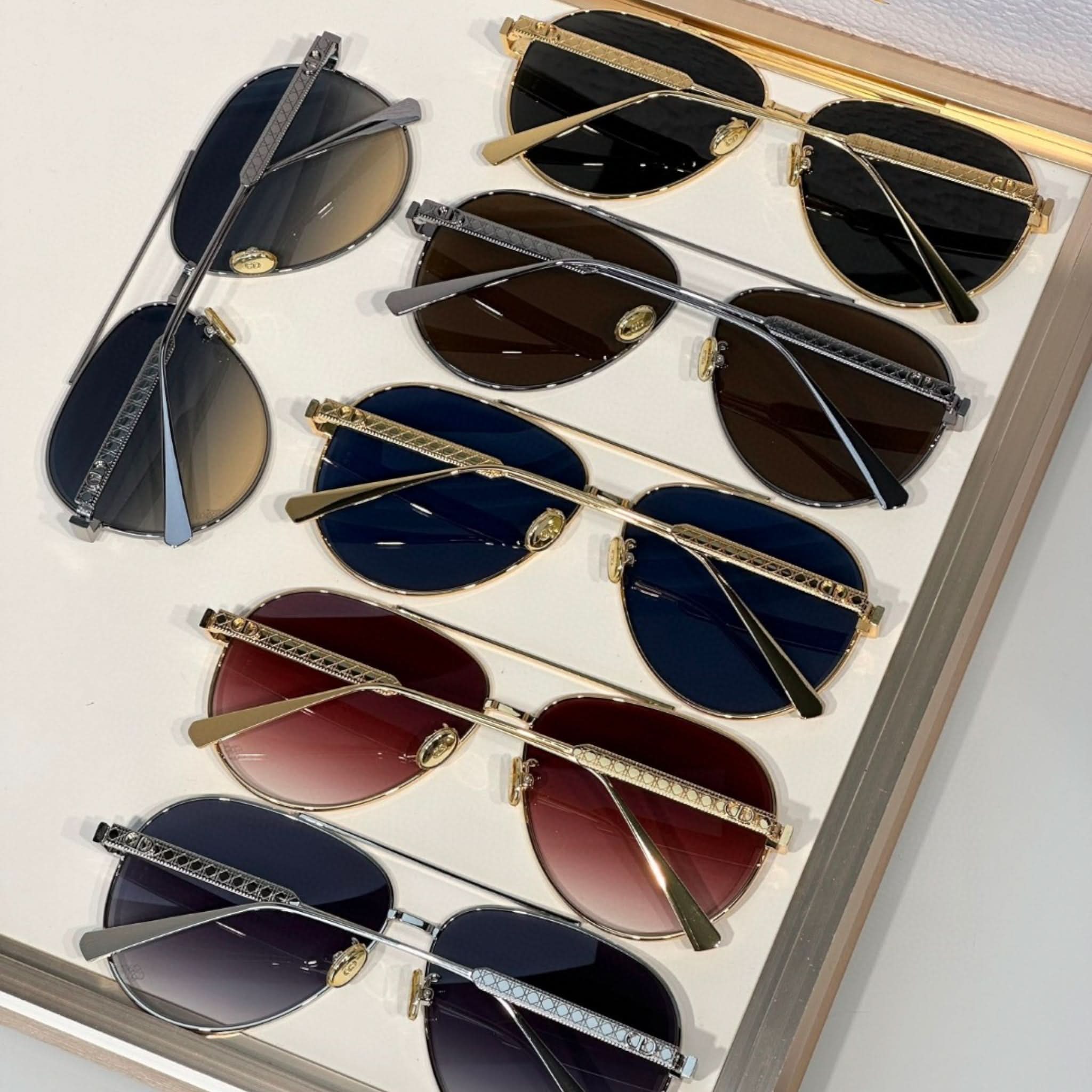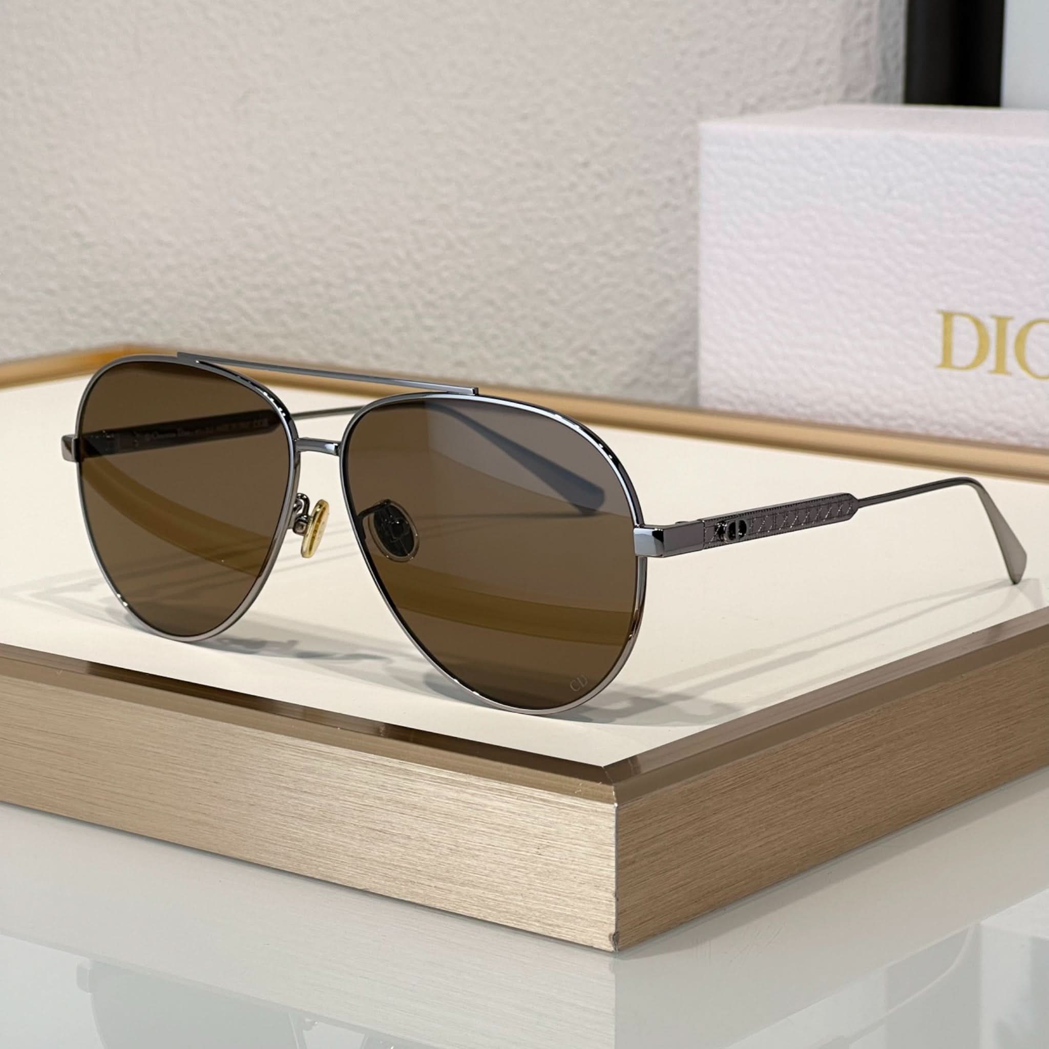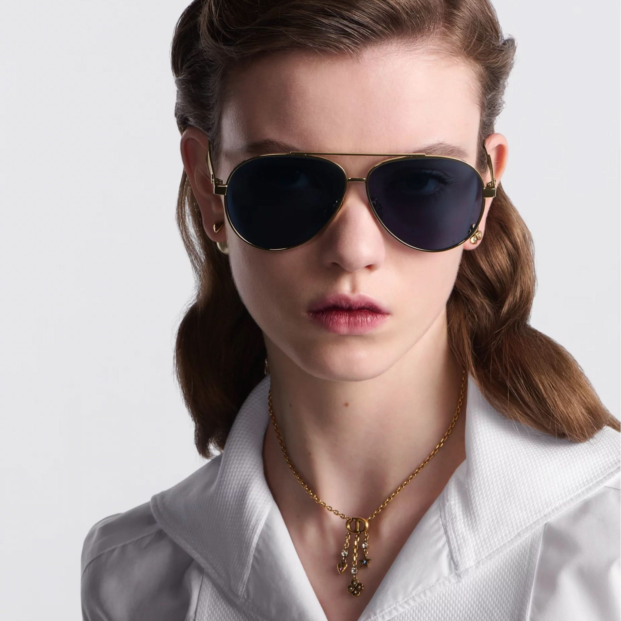 Die Sonnenbrille Eclat Doré vereint Eleganz und Modernität. Dieses Modell besticht durch seinen Pilotenrahmen aus Metall mit dem ikonischen Cannage-Motiv und wird durch filigrane CD-Gravuren an den Bügeln abgerundet. Diese Brille bietet 100 % UVA-/UVB-Schutz und ist dank ihres korrektionsfreundlichen Designs eine funktionale und stilvolle Wahl. Der Dior Schriftzug am rechten Bügel macht diese Sonnenbrille einzigartig.