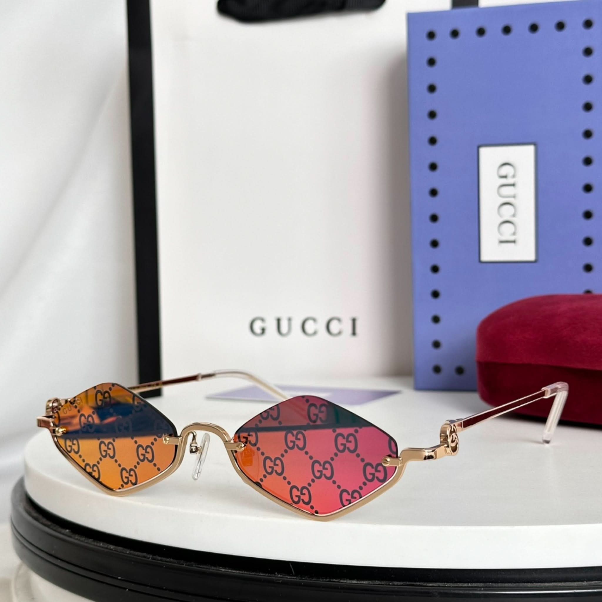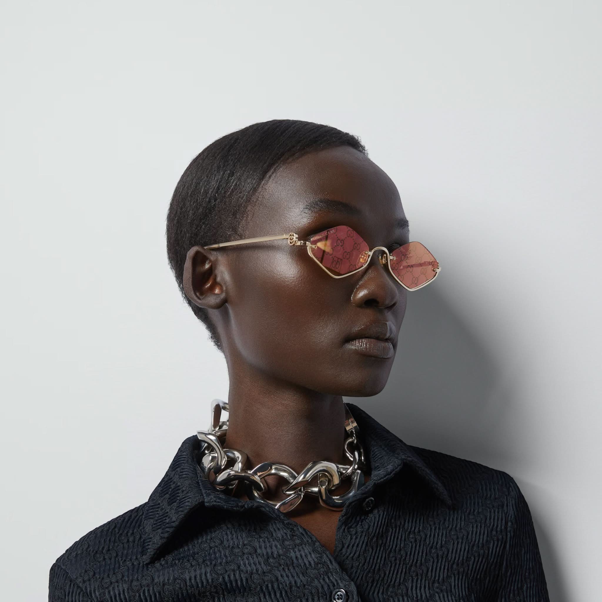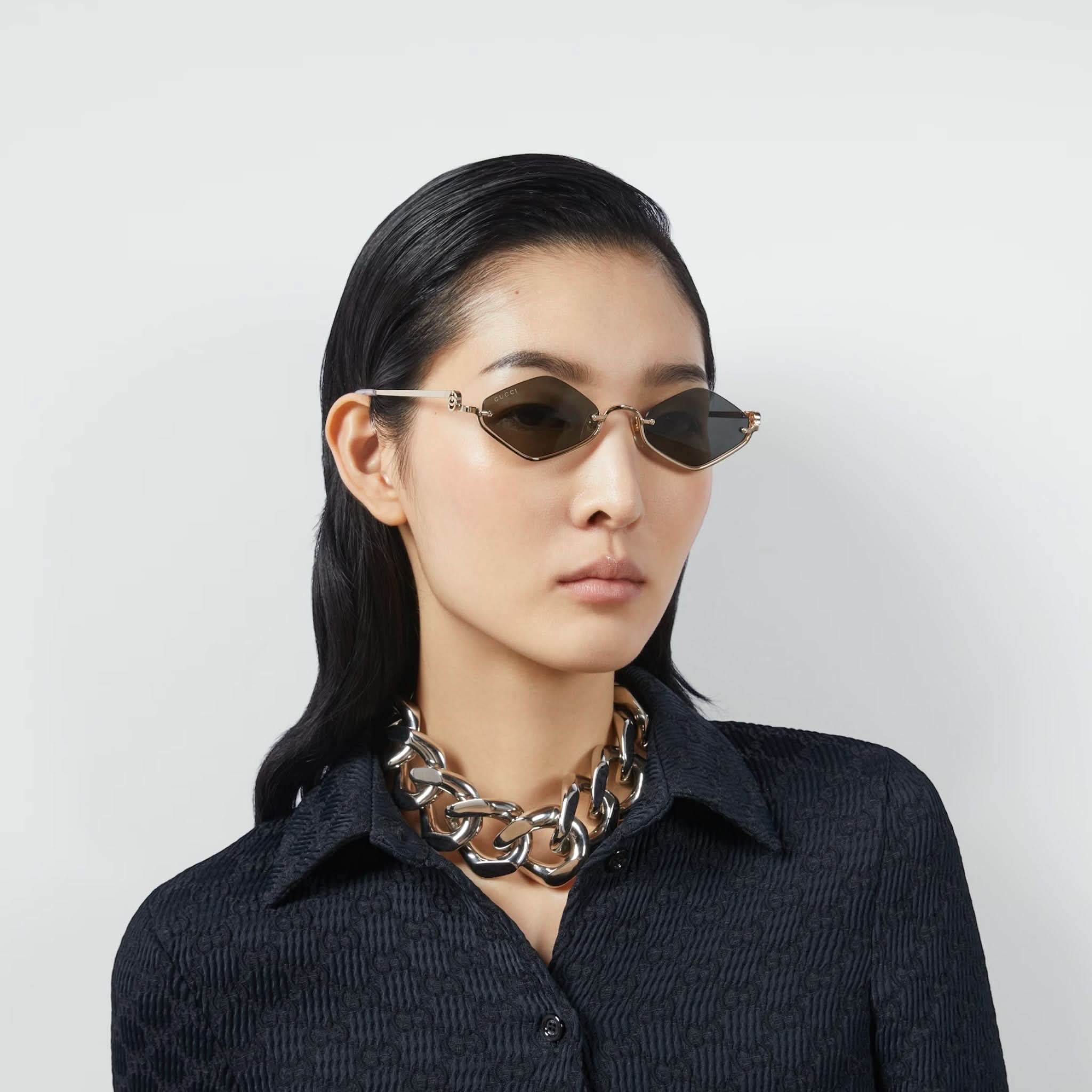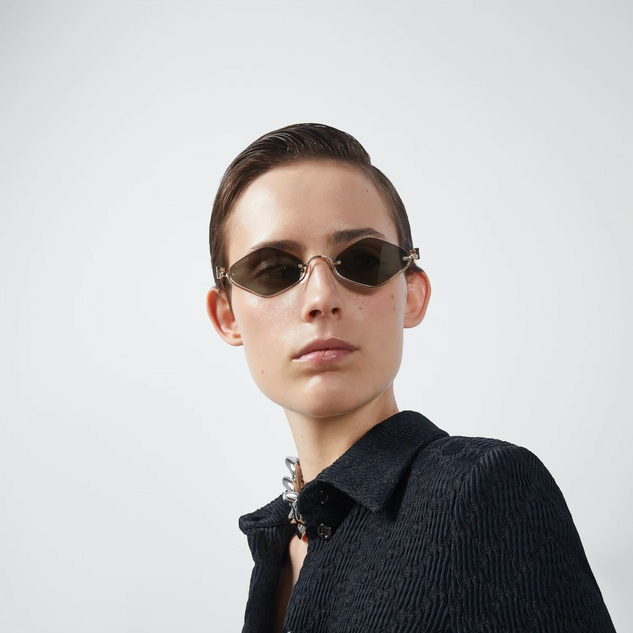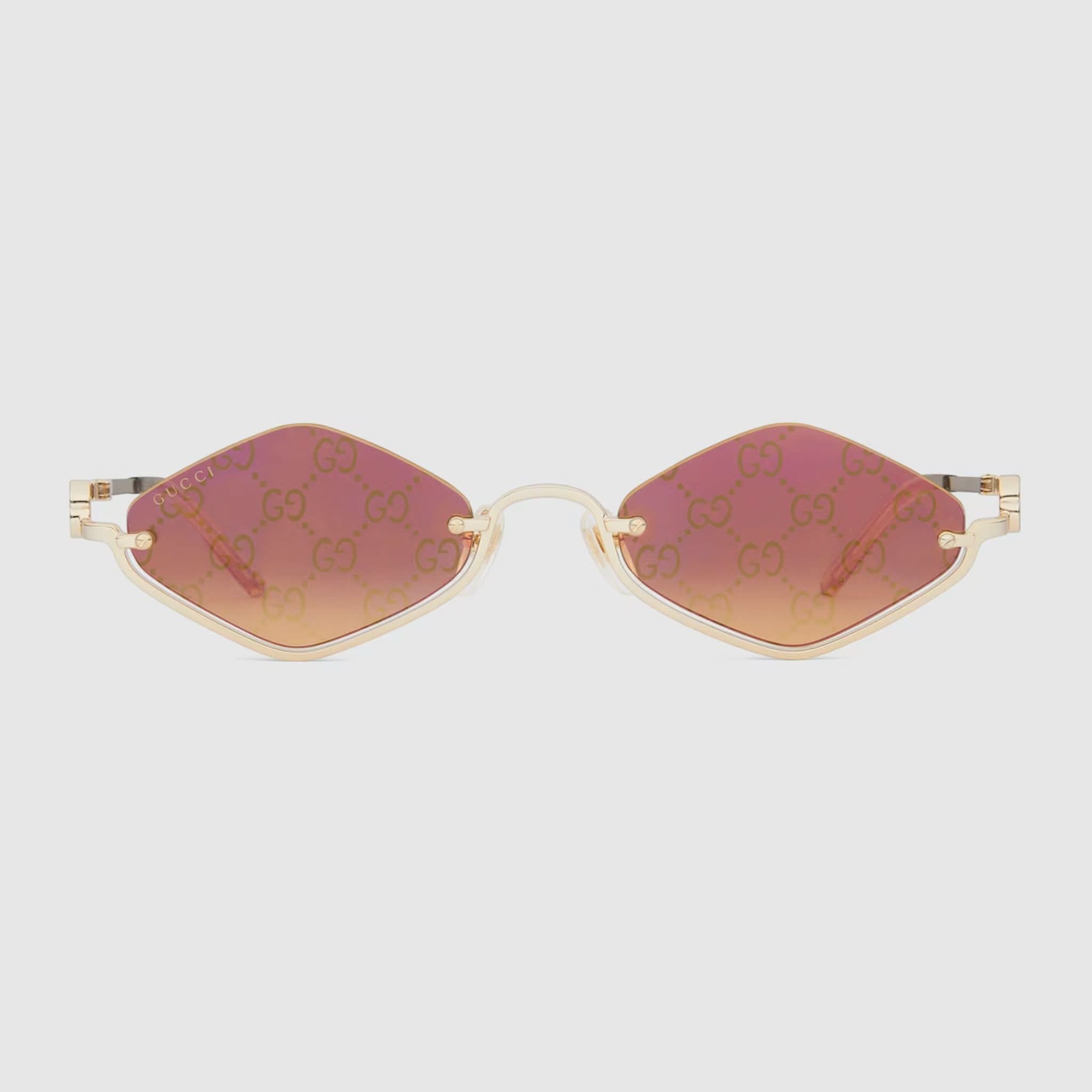Design: Der goldfarbene, geometrische Metallrahmen ist an den Bügeln mit einem Doppel-G-Schliff verziert.